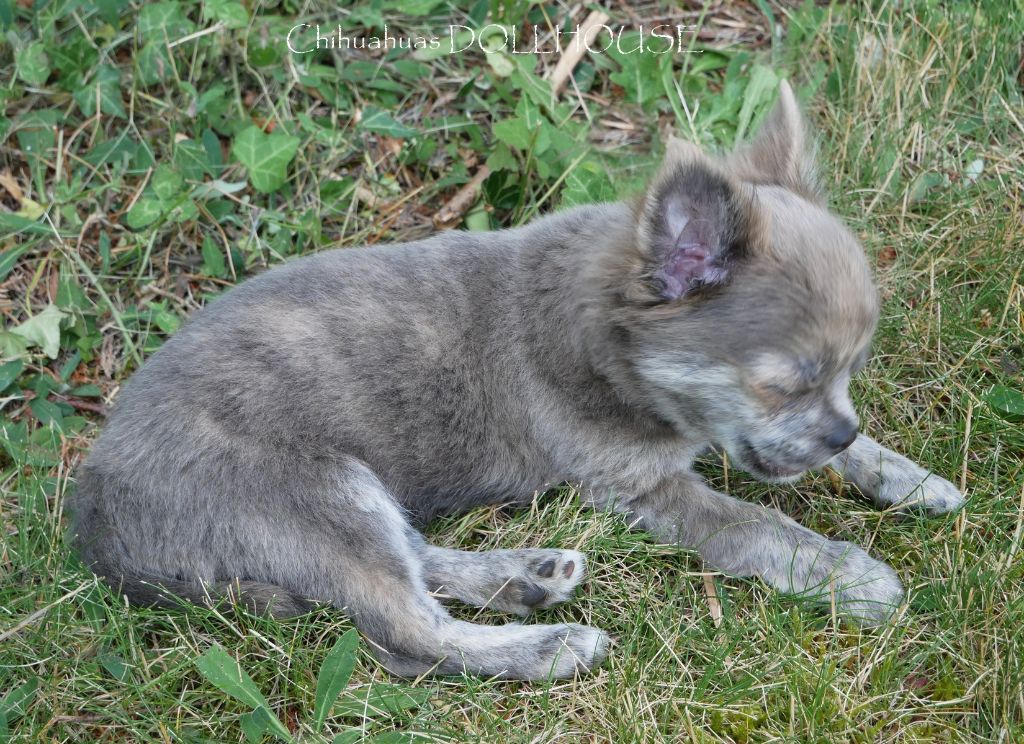 Mon coup de coeur ! Couleur très rare et confidentielle , pour ce magnifique mâle de couleur "acier" bringé, marquage fauve bringé poil long, occlusion dentaire parfaite à ce jour ( 6/6 en bons ciseaux ), ses deux testicules sont en place. Excellent type, morphologie et caractère, nez court. C'est C'est un chiot de gabarit standard qui va se situer dans les 2,5 kg / 2.6 kg adulte, sa fourrure est déjà très épaisse. C'est un petit chien robuste, et sportif qui pourra vous accompagner partout. Il est élevé dans un cadre familial au contact d'humains, de chiens et d'une petite minette très douce. Renseignements / réservation au 0612589112, ou par le site rubrique "contact" merci. Possibilités de le payer en 3 mensualités. Des photos supplémentaires sont disponibles sur mon compte Facebook ! https://www.facebook.com/chihuahuadollhouse